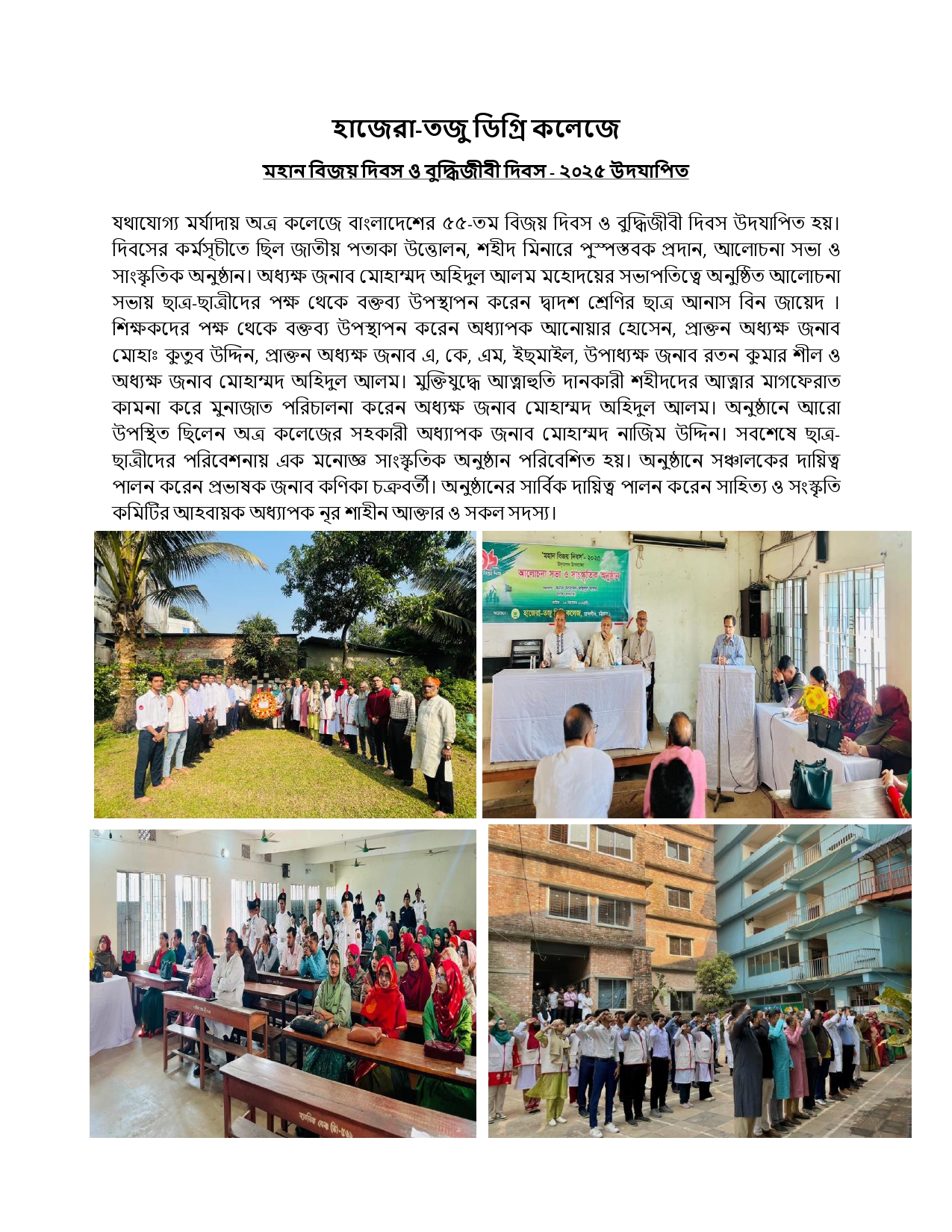 | হাজেরা-তজু ডিগ্রি কলেজে মহান বিজয় দিবস ও বুদ্ধিজীবী দিবস - ২০২৫ উদযাপিত Active New General | 2025-12-16 | Download |