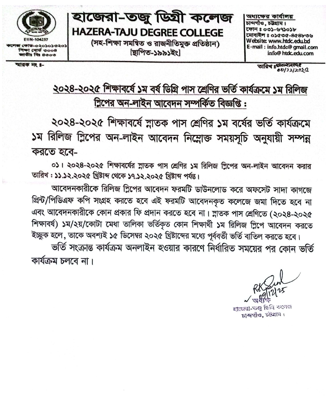 | ২০২৪-২০২৫ শিক্ষাবর্ষে ১ম বর্ষ ডিগ্রি (পাস) শ্রেণির ভর্তি কার্যক্রমে ১ম রিলিজ স্লিপে ভর্তি সংক্রান্ত বিজ্ঞপ্তি। Active New Degree | 2025-12-21 | Download |