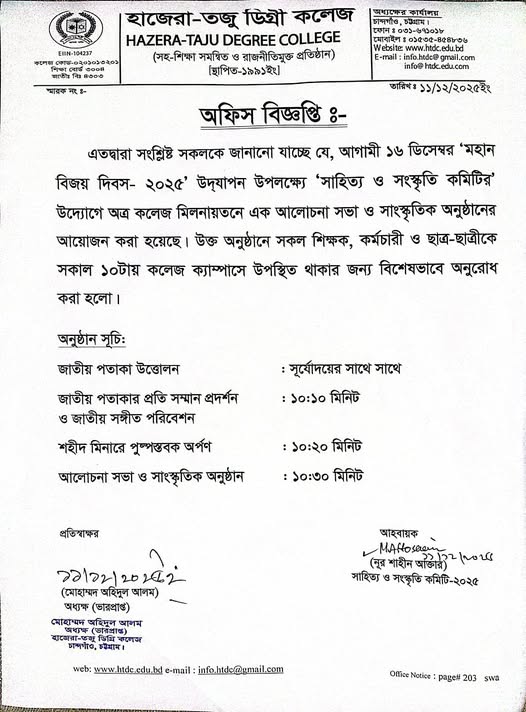 | হাজেরা-তজু ডিগ্রি কলেজে মহান বিজয় দিবস ও বুদ্ধিজীবী দিবস - ২০২৫ উদযাপিত Active New General | 2025-12-16 | Download |